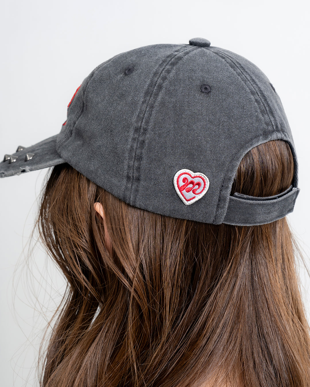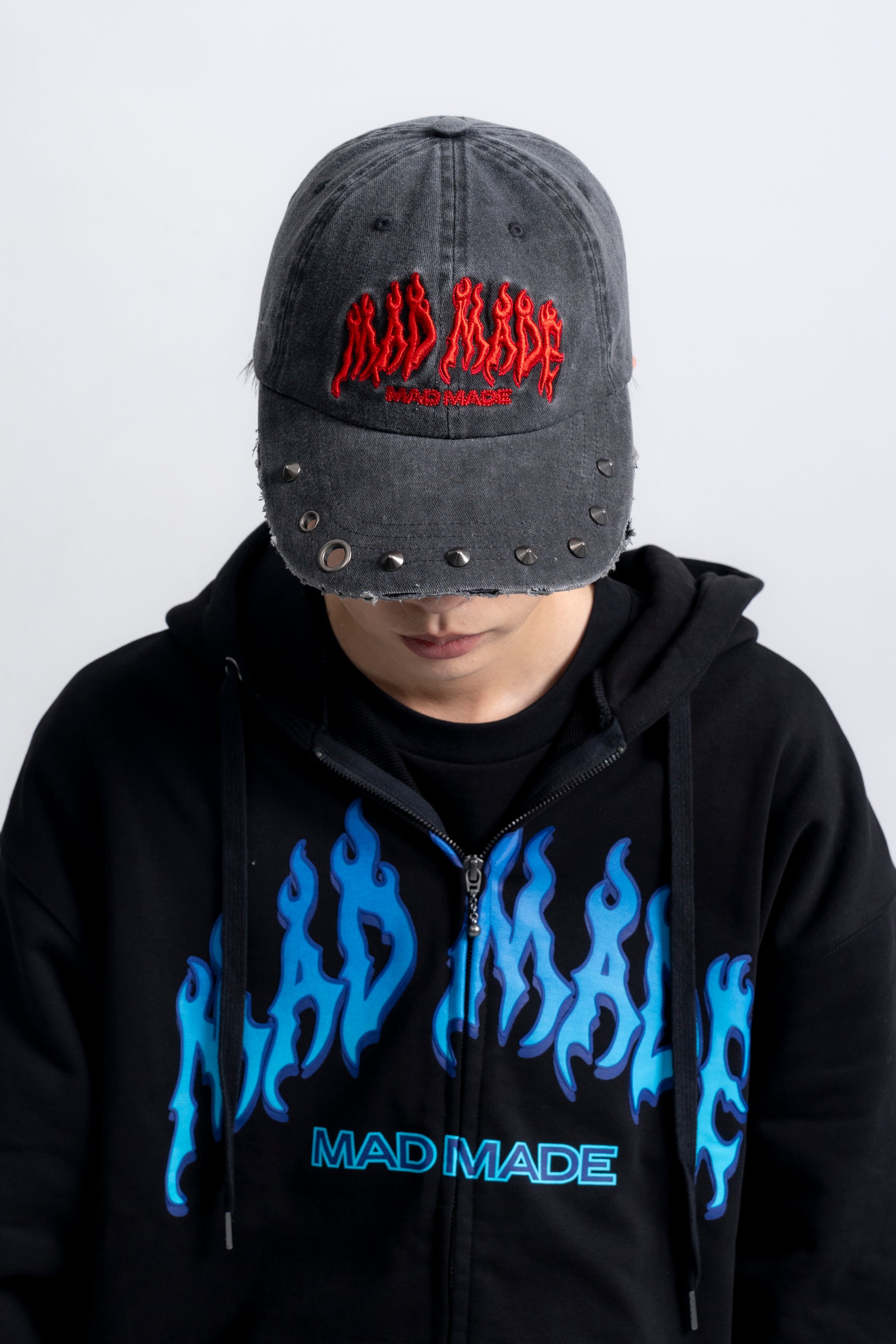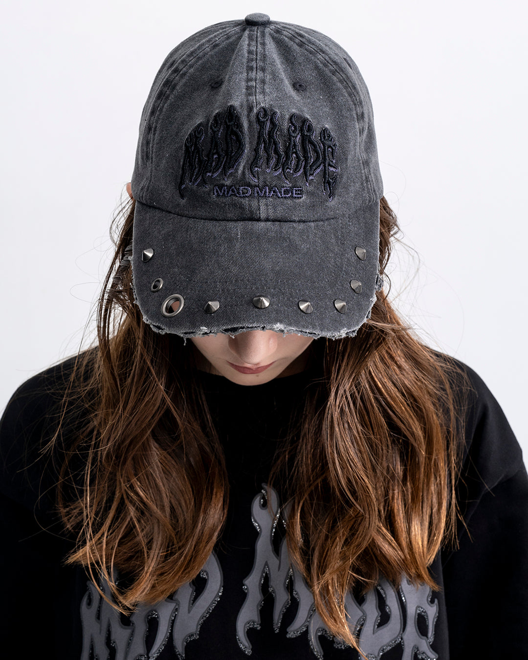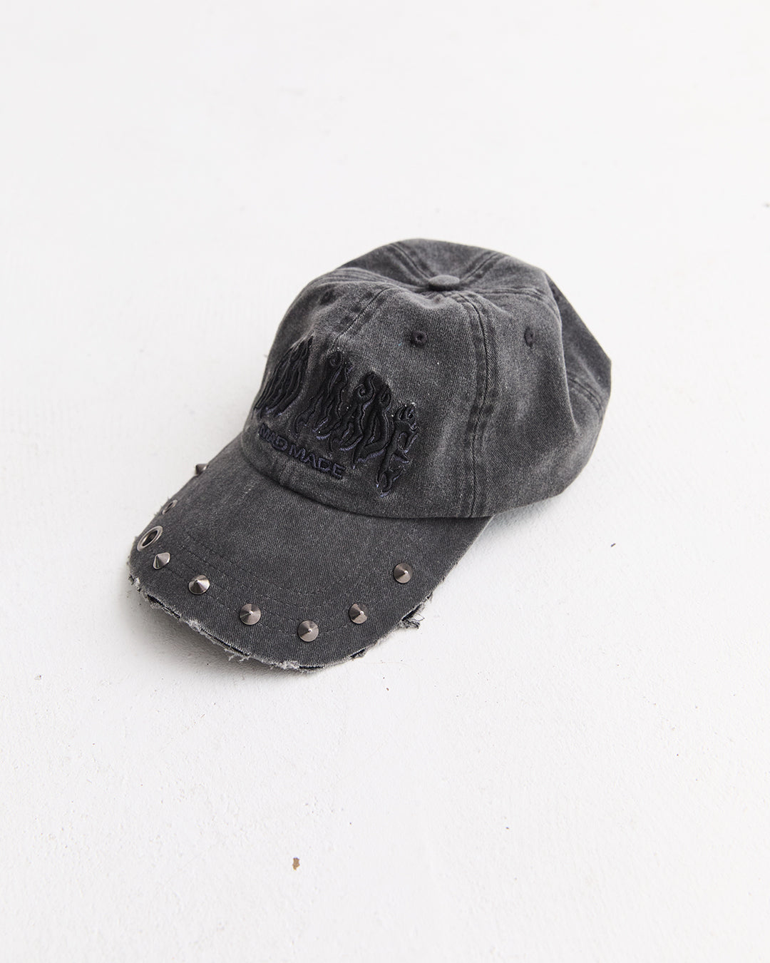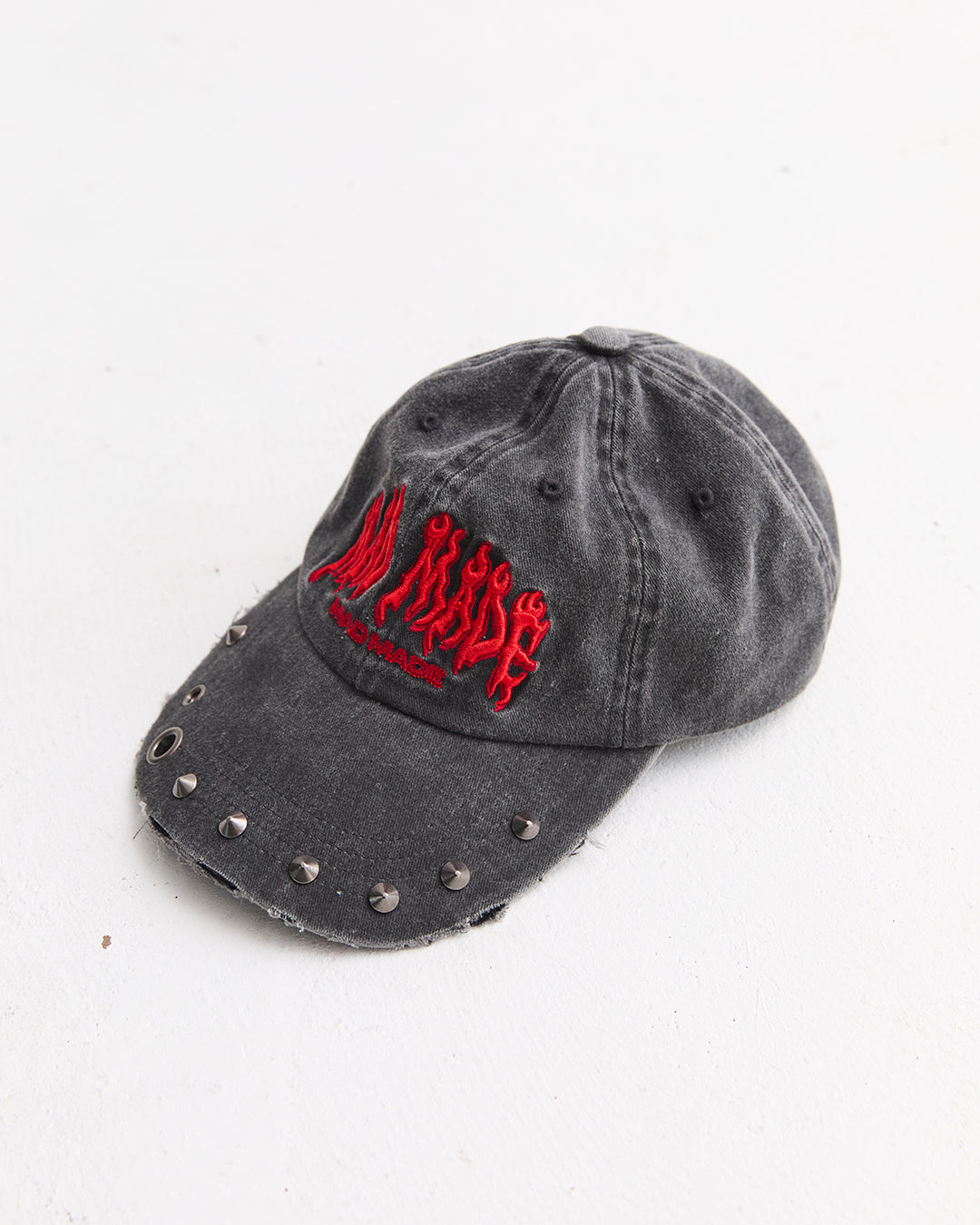 フロントにファイヤーパターンを3D刺繍、ツバにスタッヅとハトメを打ち込み装飾しています。